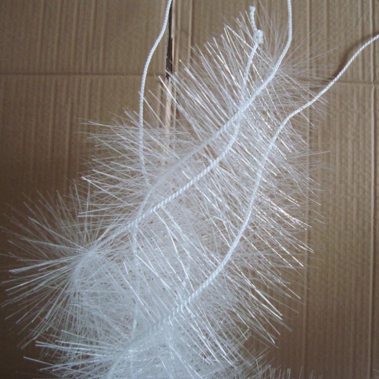 彈性填料篩選用聚烯烴類和聚酰胺中的幾種耐腐、耐溫、耐老化的品種,混合以親水、吸附、抗熱氧等助劑,采用特殊的拉絲、絲條制毛工藝,將絲條穿插同著在耐腐、高強度的中心繩上。由于選材和工藝配方精良,剛柔適度,使絲條呈立體均勻排列輻射狀態,制成了懸掛式立體彈性填料的單體.填料在有效區域內能立體全方位均勻舒展滿布,使氣、水、生物膜得到充分混滲接觸交換,生物膜不僅能均勻地著床在每一根絲條上,保持良好的活性和空隙可變性,而且能在運行過程中獲得大的比表面積。